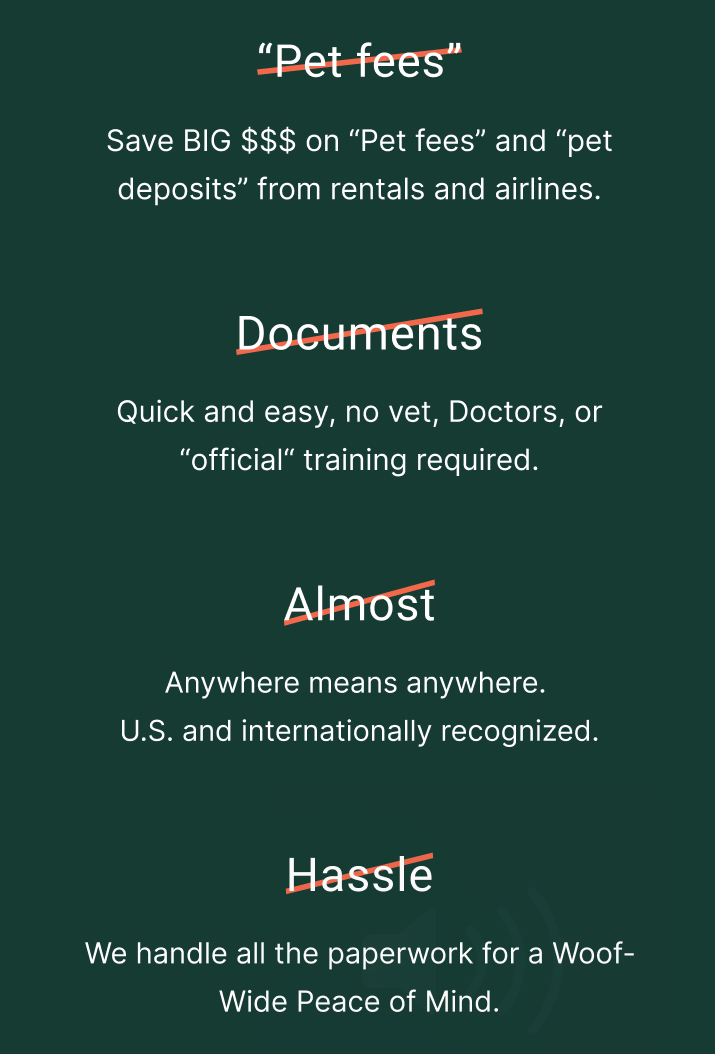 Register your dog to fly by your side (yes, even to USA & Europe), live and rent in any home, and join you at any venue; stress-free. We handle the details, so you can focus on making paw-some memories together.